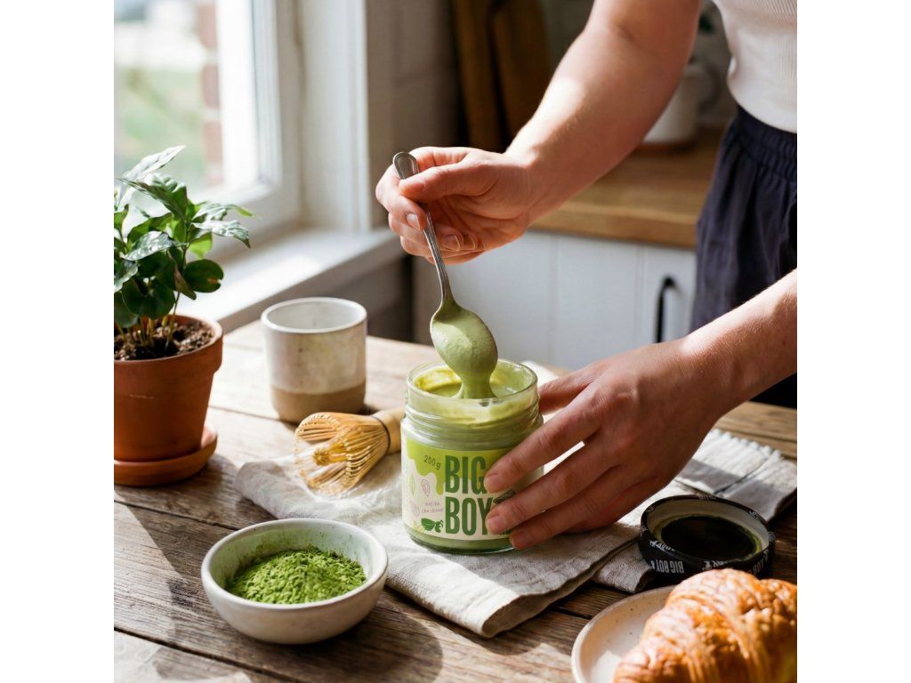 mleté blanšírované mandle 57,5 %, trstinový cukor v prášku, rastlinný tuk – bambucký, biela čokoláda (cukor, kakaové maslo, sušené plnotučné mlieko, emulgátor: lecitíny (sója), prírodná vanilková aróma), sušený rastlinný nápoj (extrakt z dužiny kokosového orecha, ryžový maltodextrín), zelený čaj matcha 1 % (Krajina pôvodu: Japonsko). Môže obsahovať stopy arašidov a iných orechov.