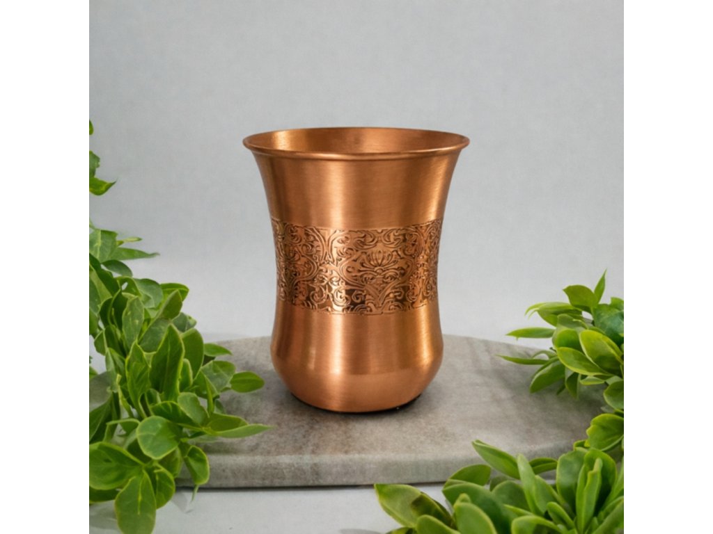 Tento jedinečný ručne vyrobený pohár so zaobleným tvarom a starožitným leptaným okrajom je vyrobený z čistej medi. Ide o extra ťažkú ​​120-gramovú verziu s objemom 300 ml.