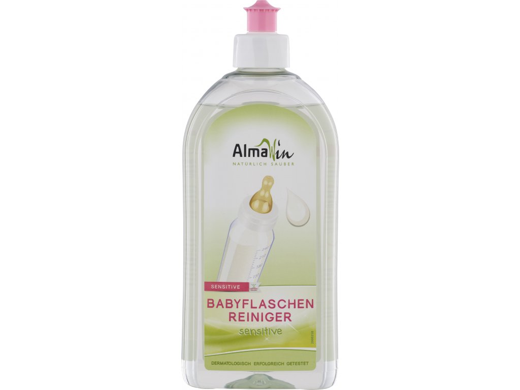 AlmaWin Baby Bottle Cleaner Sensitive jemně, ale důkladně odstraňuje mléčnou bílkovinu, šťávu a zbytky jídla z kojeneckých lahví, saviček, dětského nádobí a omyvatelných hraček.