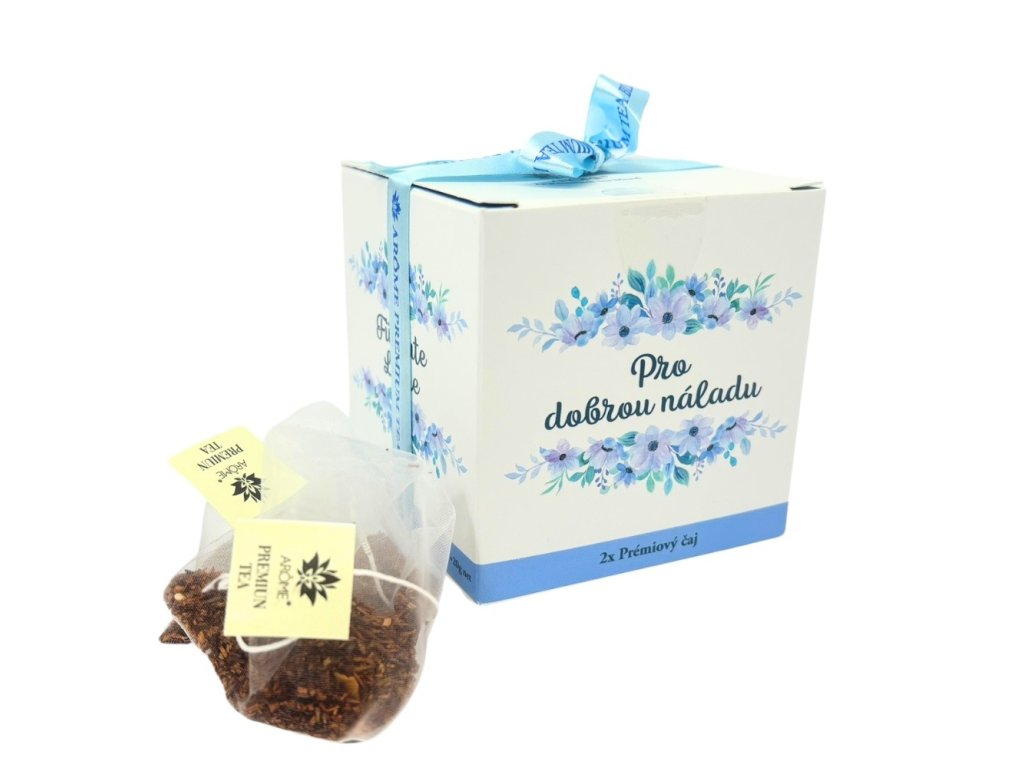 Lahodný zelený čaj ze Srí Lanky. Dvě příchutě po 5 sáčcích – jablko a rooibos, vanilka a skořice. V barevné papírové krabičce s nápisem „Pro dobrou náladu“.