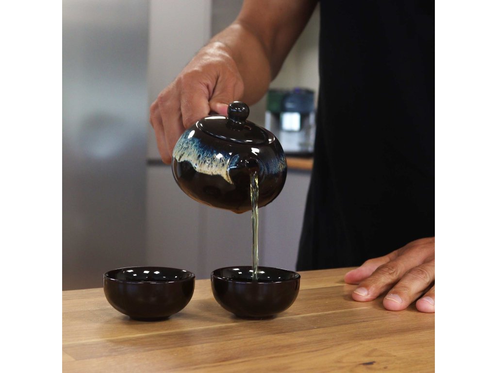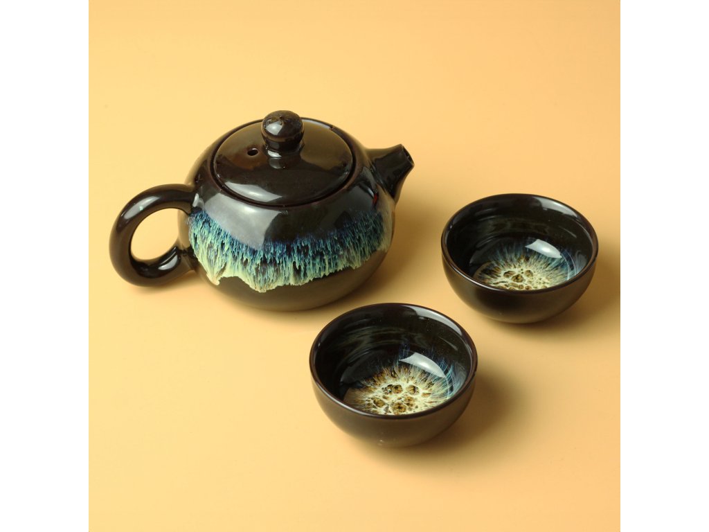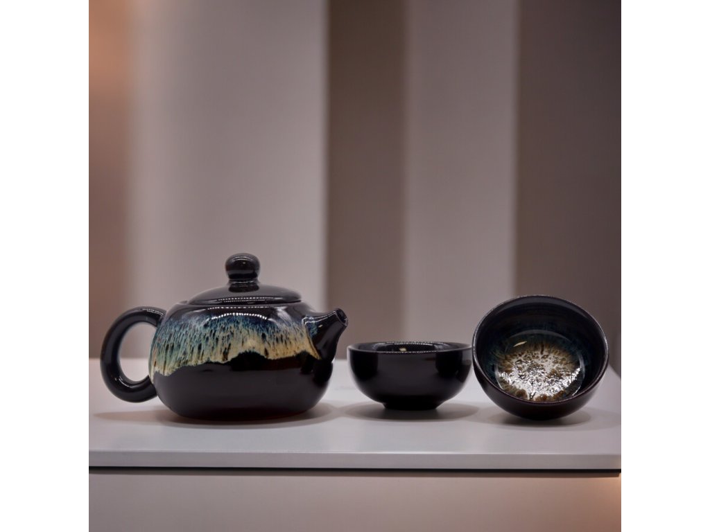 Tmavě hnědá glazura v kombinaci s působivým pískovým vzorem připomínajícím vlny dodává soupravě umělecký nádech, který lze vnímat jako abstraktní zobrazení přírody nebo jako čisté umění. Dekor uvnitř čajových misek a na povrchu konvice vytváří výrazný, jedinečný vzhled, díky kterému se odlišuje od tradičních čajových souprav.