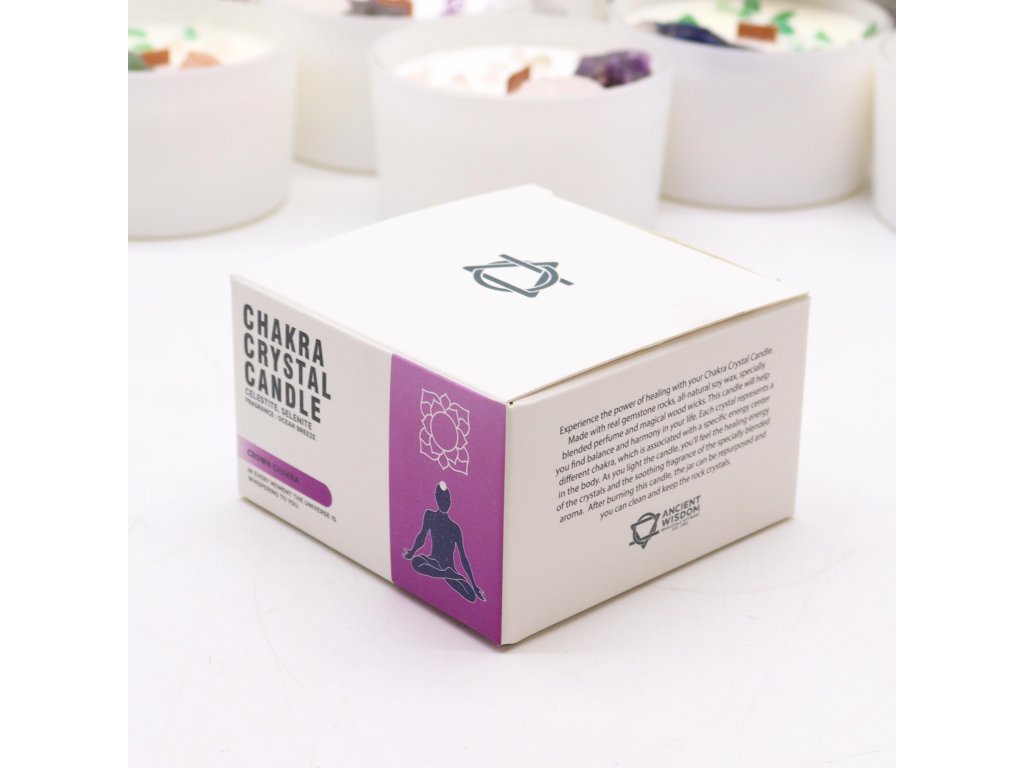 Spojte se s vyšším vědomím a duchovním osvícením prostřednictvím naší křišťálové svíčky korunní čakry. Prosycená celestitem a selenitem rezonuje s esencí korunní čakry. Osvěžující vůně Ocean Breeze pozvedne vaši duši. Krabička sděluje moudrost: "V každém okamžiku ti vesmír našeptává."