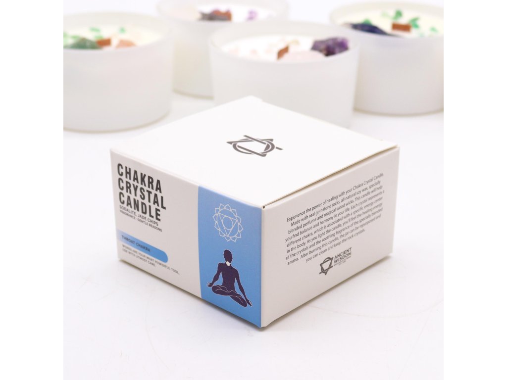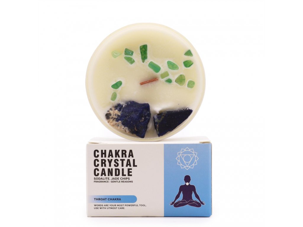Najděte svůj hlas a vylepšete komunikaci s naší křišťálovou svíčkou pro krční čakru. Tato svíčka, vyrobená z kousků sodalitu a nefritu, rezonuje s esencí krční čakry. Vůně "Gentle Reasons" podporuje vědomý a jasný projev. Na krabičce je připomenutí: "Slova jsou tvůj nejsilnější nástroj, používej je s maximální opatrností."