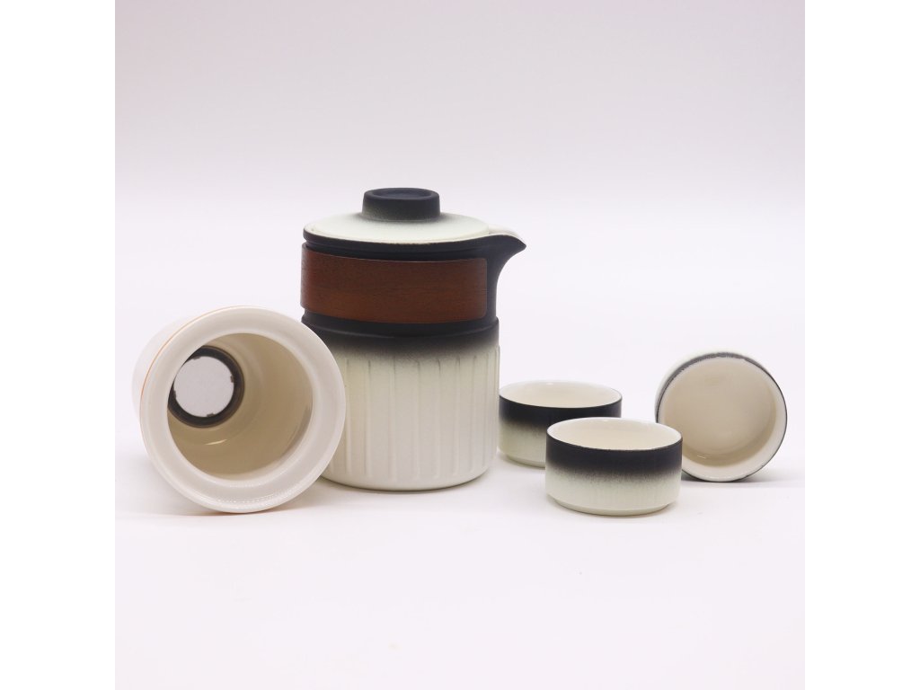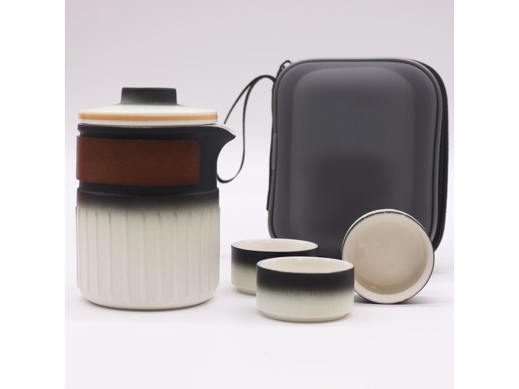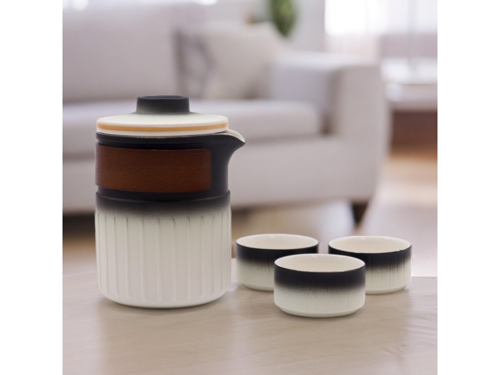 Čajník má elegantní, moderní design s hladkým bílým a černým gradientním povrchem. Obsahuje dřevěný akcentní pásek pro lepší přilnavost a estetický vzhled. Ergonomický výtok zajišťuje snadné a bezpečné nalévání. Čajník je dodáván s odnímatelným sítkem na čaj, které usnadňuje přípravu sypaných čajů a následné čištění. Šálky mají minimalistický design s černo-bílým gradientním povrchem, který dokonale doplňuje konvici.