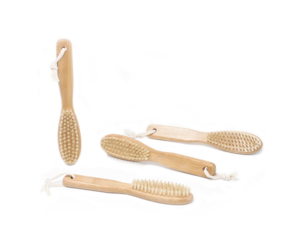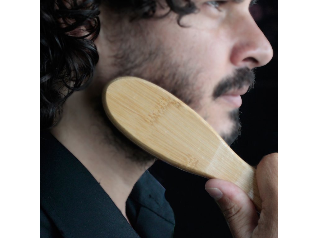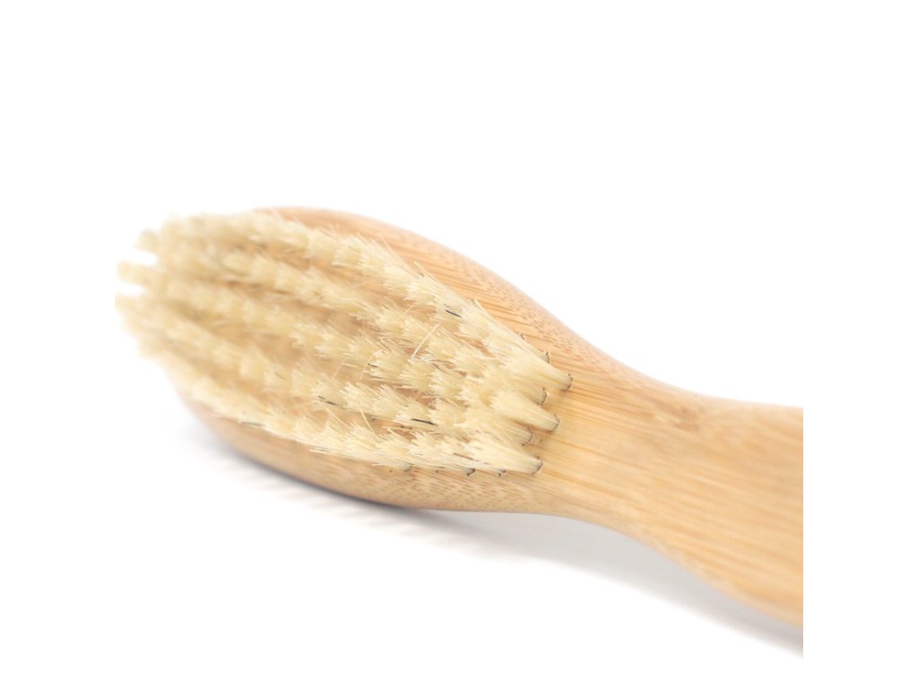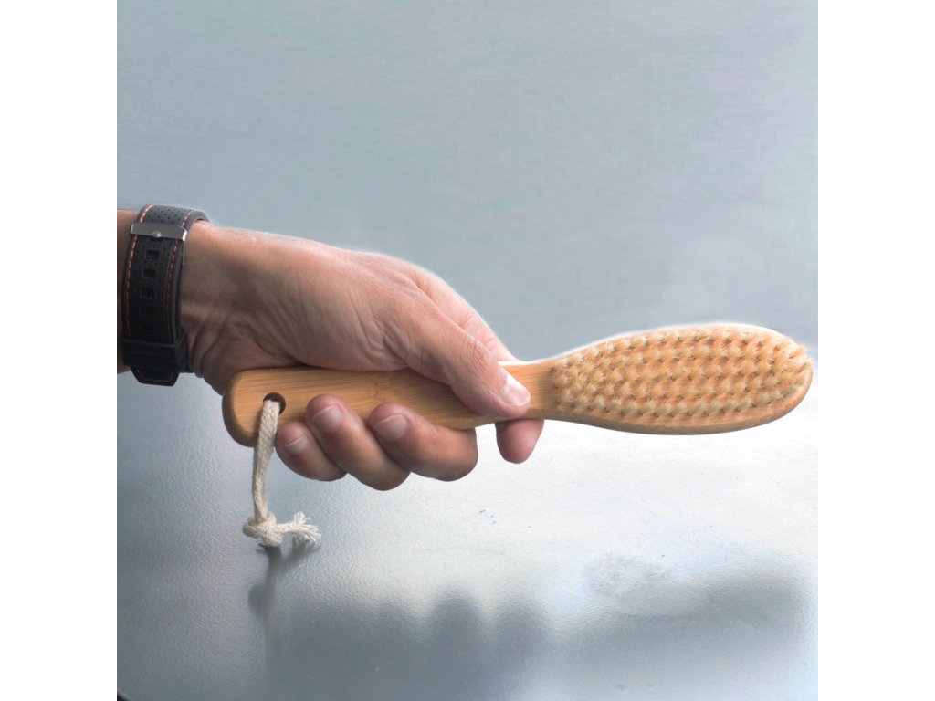 Kartáč je také ručně vyrobený z hruškového dřeva a štětiny jsou ze srsti divočáka.