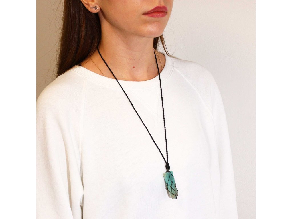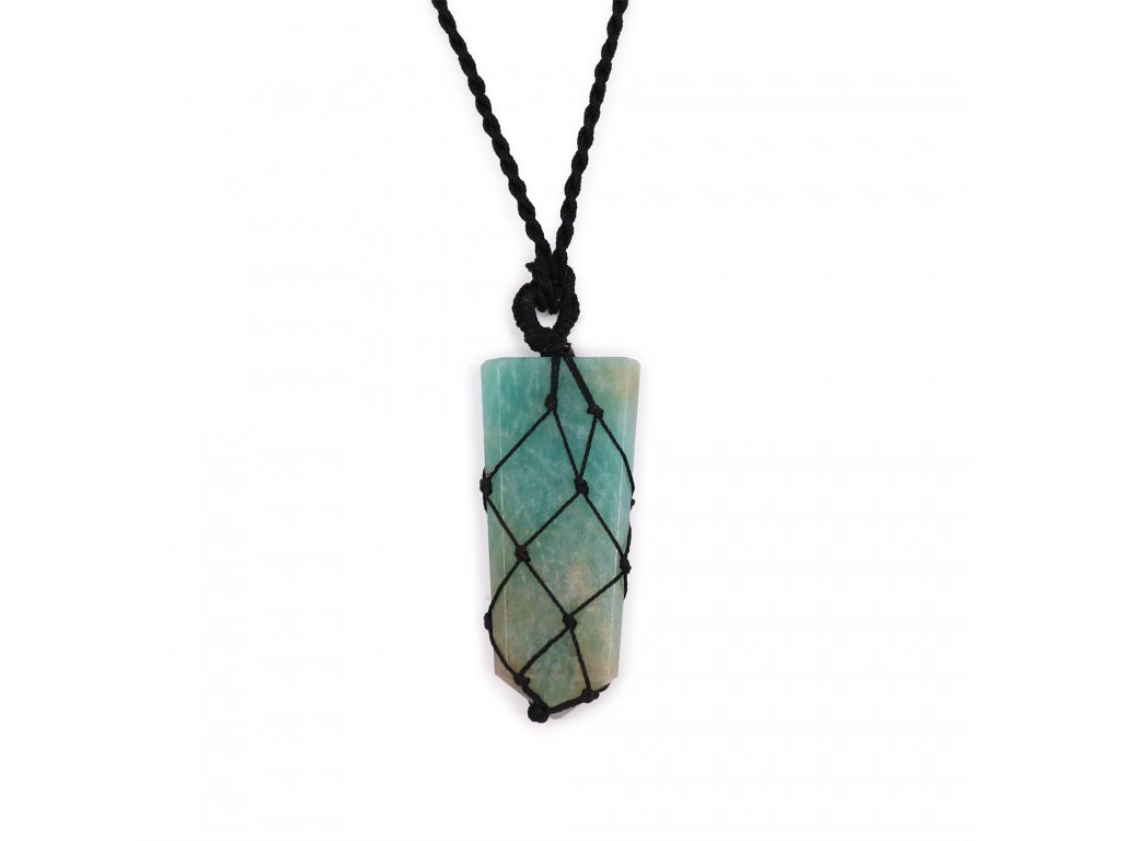 Amazonit, známý svou akvamarínově zelenou barvou s bílými pruhy, vyzařuje pocit harmonie a rovnováhy. Věří se, že podporuje sebedůvěru, sebevyjádření a emocionální pohodu. Každý amazonitový přívěsek s plochým hrotem je pečlivě opracován, což umožňuje, aby vynikla přirozená krása drahokamu. Přidání nastavitelné šňůrky zajišťuje pohodlné a přizpůsobené nošení.