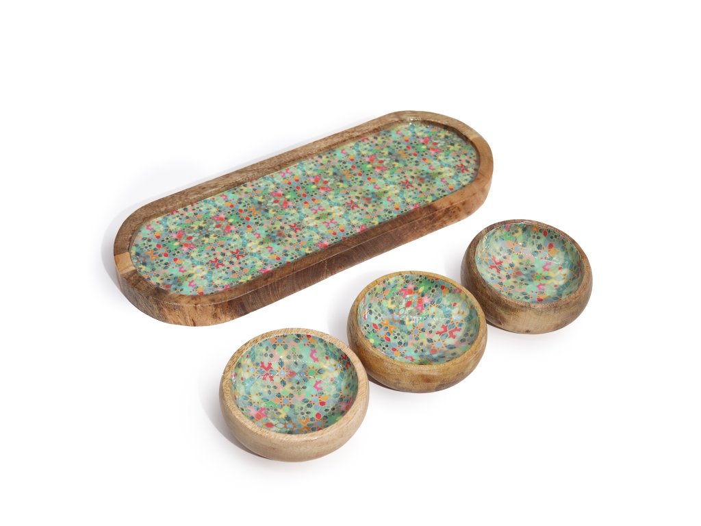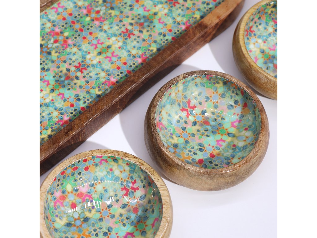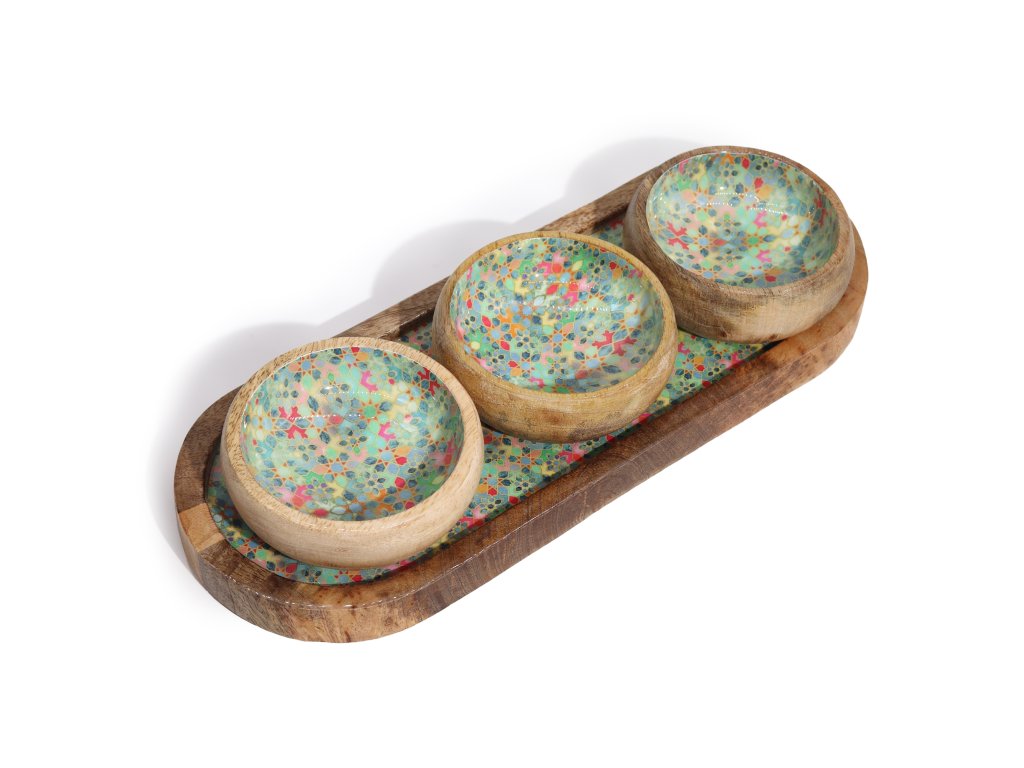 AWM Podnos z mangového dřeva se 3 miskami – Vzor středomořská dlaždice 1 ks