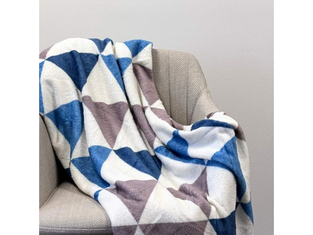 Hřejivou, lehkou mikroflanelovou deku modré barvy se vzorem trojúhelníků, rozměry 150 x 200 cm.