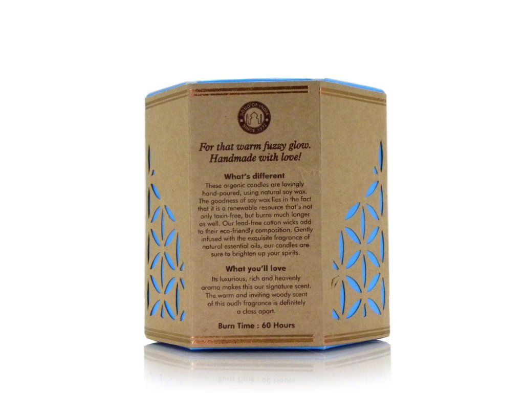 Svíčka ze sójového vosku, ručně vyrobená v Indii, hoří déle a čistěji než standardní svíčky z parafínu, nezanechává žádné stopy karcinogenů a zanedbatelné množství sazí. Sójový vosk neobsahuje toxiny a je obnovitelný zdroj, který je přírodní a má delší životnost. Ručně nalito do jantarově zbarvené skleněné nádoby,