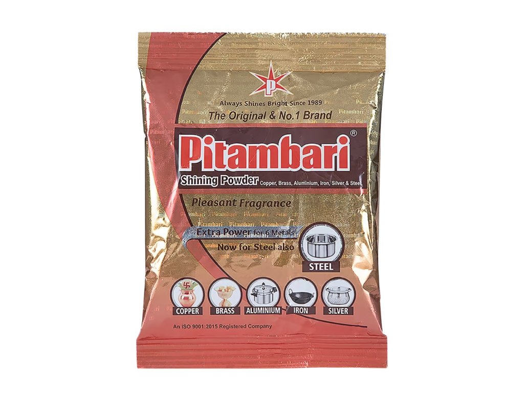 Obnovte přirozený lesk vašich měděných a mosazných předmětů s měděným práškem Pitambari (Lesklý prášek) – tradičním a účinným čisticím práškem založeným na jedinečné směsi jemných, přírodních složek.