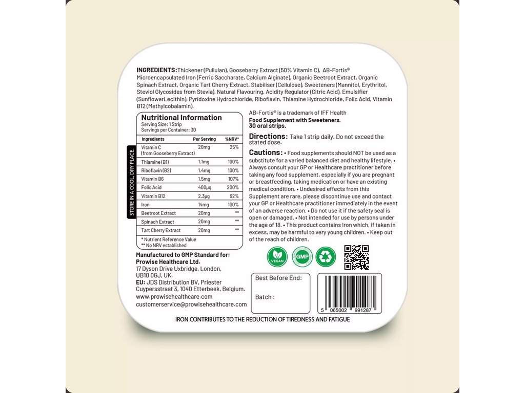 Zloženie - obsah aktívnych látok v 1 pásiku= Odporúčaná denná dávka: Vitamín C (Gooseberry - Amla): 20mg/ 25 % RVH, Extrakt z červenej repy (Beetroot): 20mg/*, Extrakt zo špenátu (Spinach): 20mg/*, Extrakt z čerešní (Tart Cherry): 20mg/*, Železo (AB-Fortis®): 14mg/100 % RVH, Vitamín B2 (Riboflavín): 1,4mg/100 % RVH, Vitamín B1 (Thiamín): 1,1mg/100 % RVH, Kyselina listová (Folát): 400μg/200 % RVH, Vitamín B12 (Methylkobalamín): 2,3μg/92 % RVH ( * RVH referenčná výživová hodnota nieje definovaná) Ostatné zložky:zahusťovadlo (pullulan), Stabilizátor (celulóza),Regulátor kyslosti (kyselina jablčná),Sladidlá (sorbitolový sirup, erytritol, steviol-glykozidy zo stévie), Prírodná aróma: mix ovocie, Emulgátor (slnečnicový lecitín).