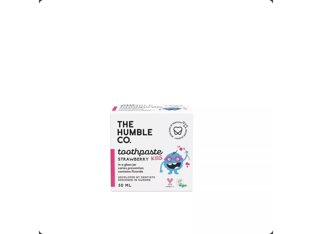 Naša detská zubná pasta Humble je starostlivo vyvinutá tak, aby predchádzala vzniku zubného kazu a aktívne chránila pred zubným povlakom. Vhodná pre deti vo veku 2 – 6 rokov. Zubná pasta neobsahuje SLS ani parabény, má prírodnú jahodovú príchuť a obsahuje 1000 ppm fluoridu sodného. Dodáva sa v 50 ml tégliku.